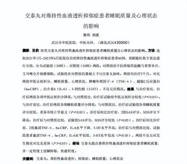 [1]熊玮 ,交泰丸对维持性血液透析抑郁症患者睡眠质量及心理状态的影响,武汉市中医医院,2024-07-11